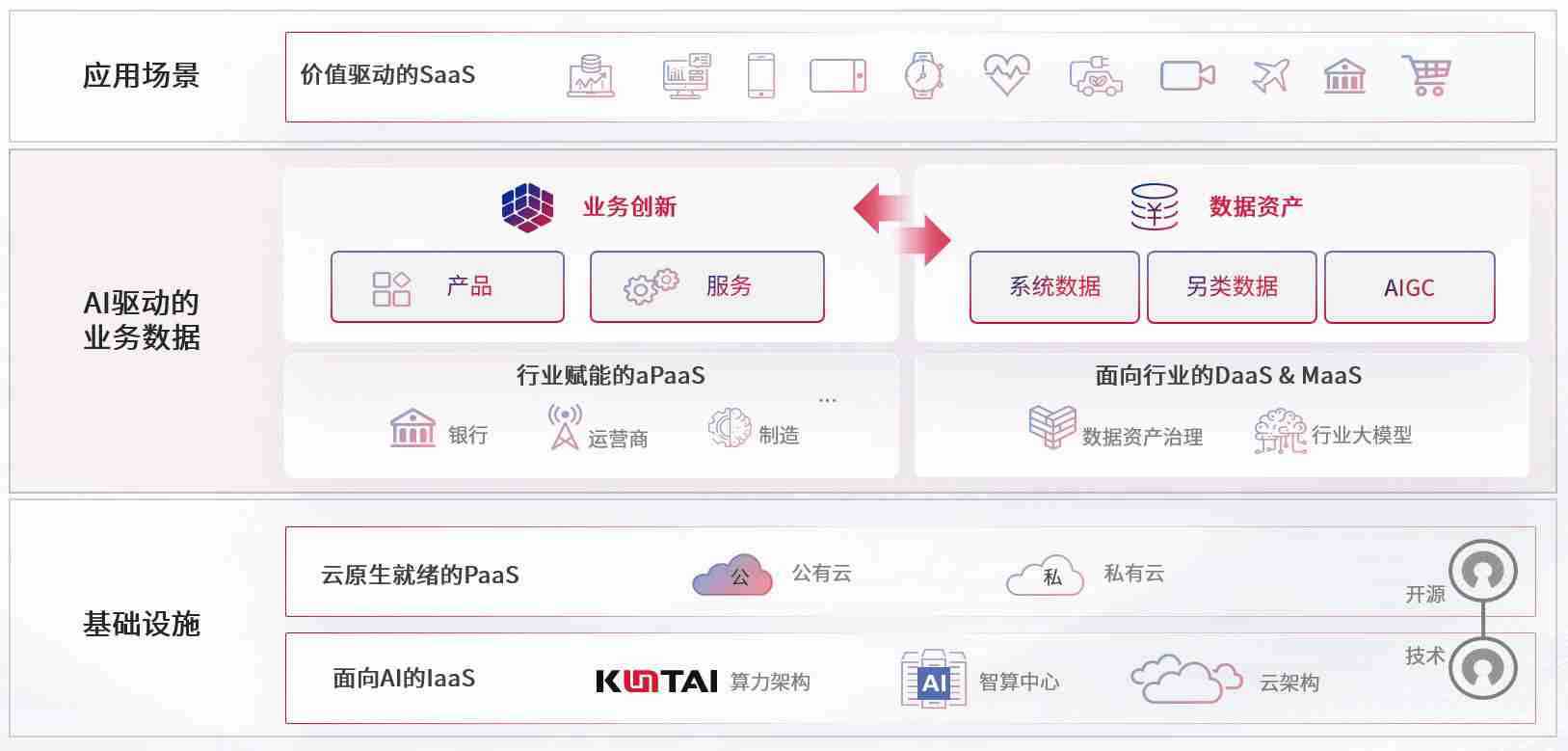 数字时代,,,围绕企业数字化转型的关键要素,,太阳成集团122ccvip数码开创性的提出数云融合战略和技术体系框架,,,,着力在云原生、、、、数字原生、、AI原生和信创产业上架构产品和服务能力,,,为处在不同数字化转型阶段的快消零售、、、汽车、、、、金融、、医疗、、、政企、、、、教育、、、运营商等行业客户提供泛在的敏捷IT能力和融合的数据驱动能力,,构建跨界融合创新的数字业务场景和新业务模式,,,助力企业级客户建立面向未来的核心能力和竞争优势,,,全面推动社会的数字化、、、智能化转型升级。。
