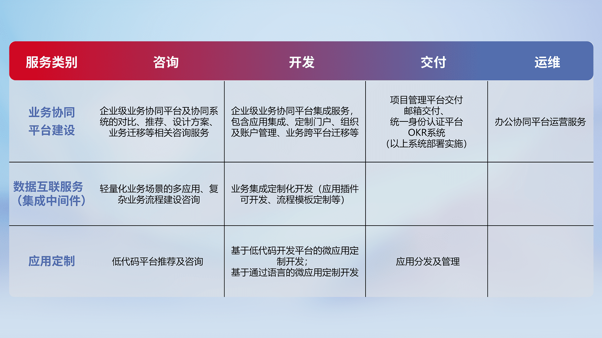 针对钉钉、、、企微、、、、IDaas等平台级产品提供产品的规划、、方案、、、交付、、、定制化开发等服务,,实现如统一协同办公、、、、智能客户服务、、混合会议管理、、、智能数据查询、、、、等业务场景,,实现数字化转型。。